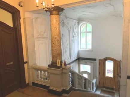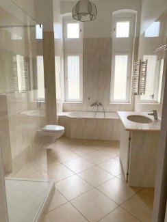 - mit hohen Stuckdecken, Schiebetüren etc.